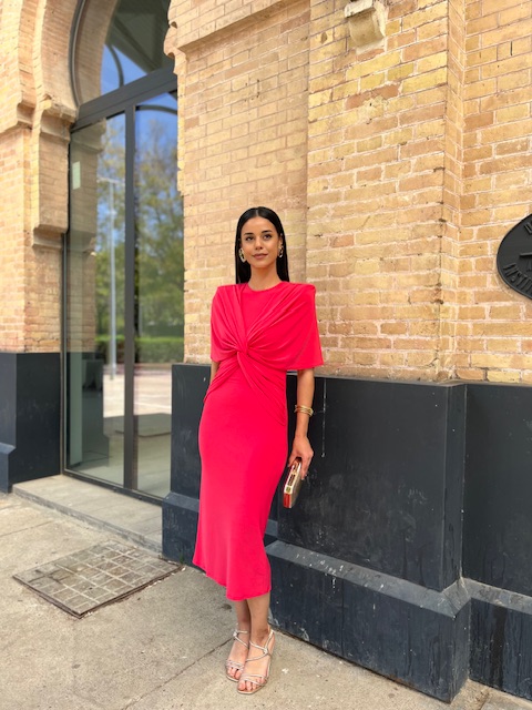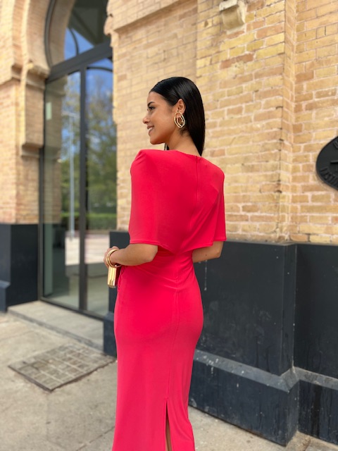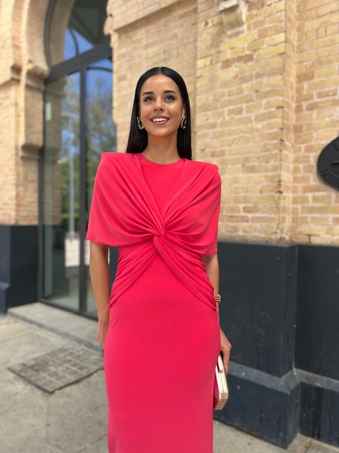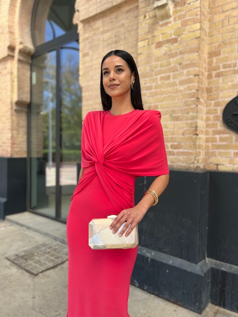 Vestido de invitada confeccionado en crepé elástico con nudo central y hombreras. Lleva forro interior. Disponible por tallas. Confeccionado en España.