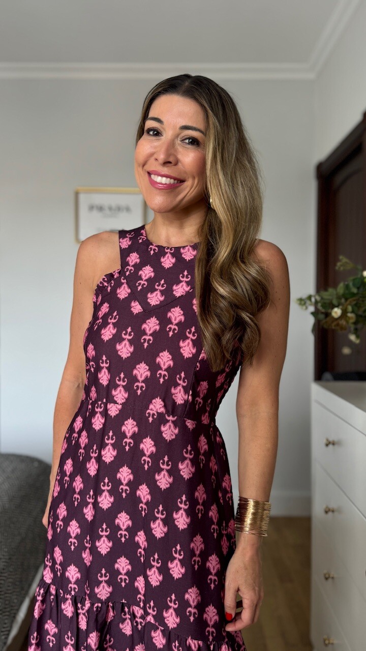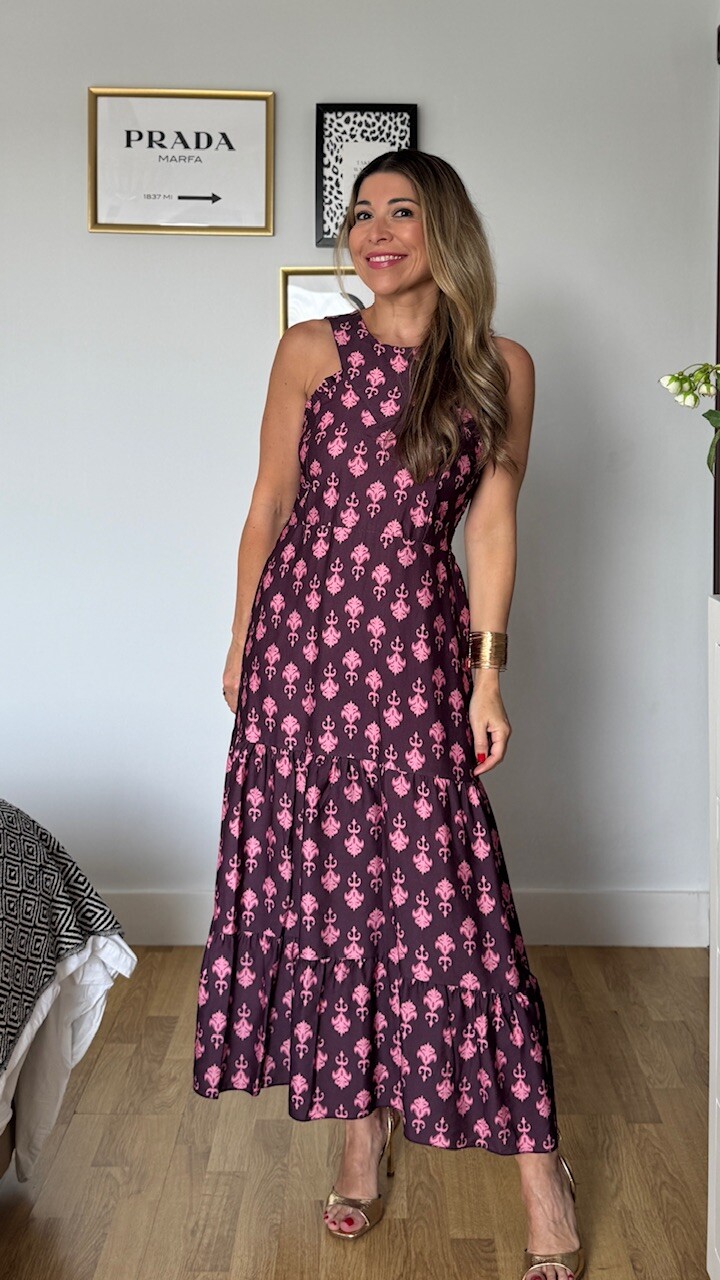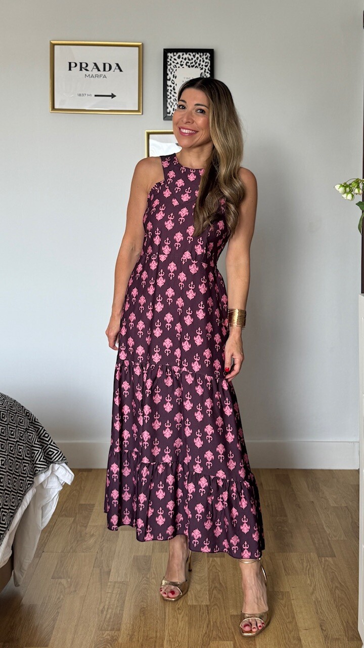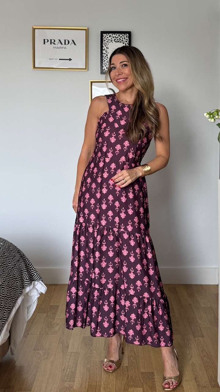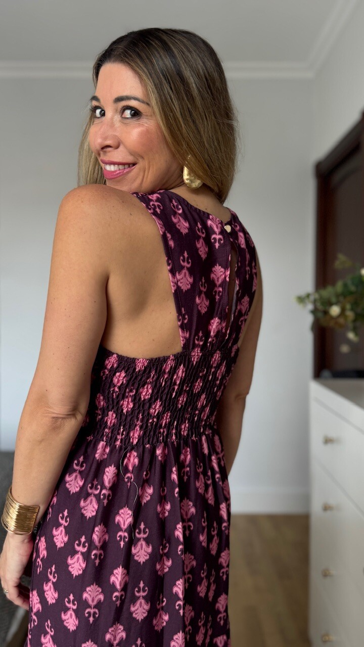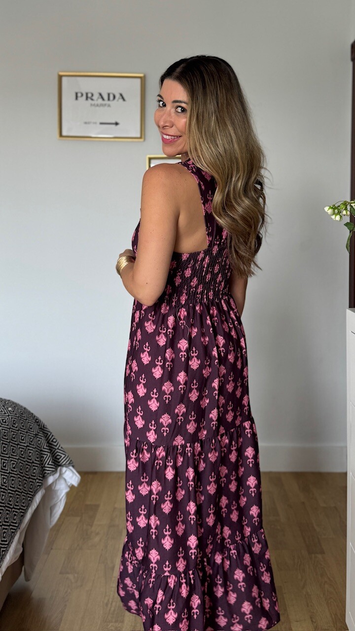 Vestido midi con estampado en berenjena y rosa  lleva mangas a la sisa con cuello redondo y nido de abeja en la parte trasera . Talla única válida desde la talla 36 hasta la talla 40/42.