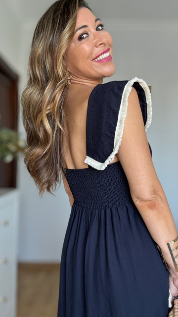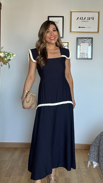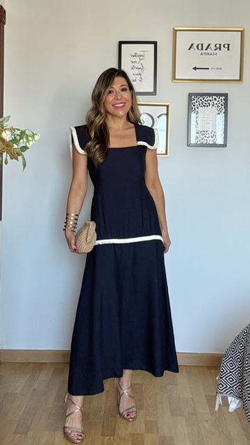 Vestido confeccionado en tejido simulando el lino en color azul marino. Talla única válida desde la talla 36 hasta la 40/42.