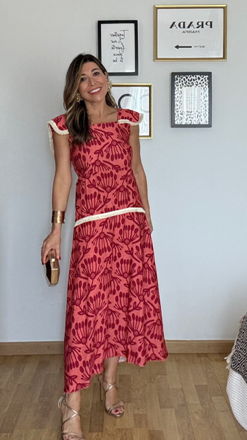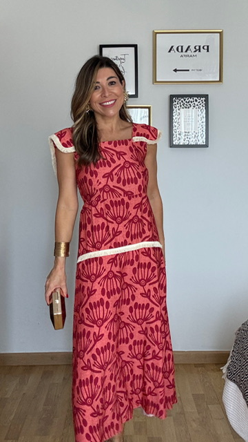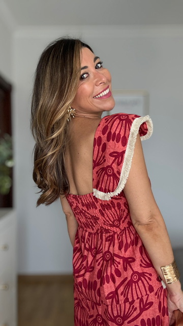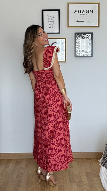 Vestido confeccionado en tejido simulando el lino en color coral con flores estampadas. Talla única válida desde la talla 36 hasta la 40/42.