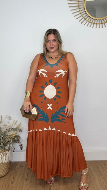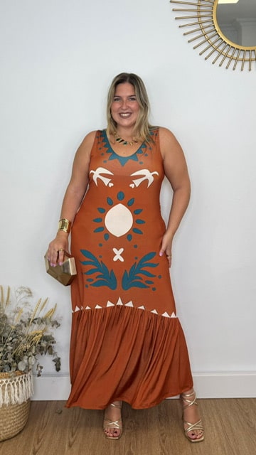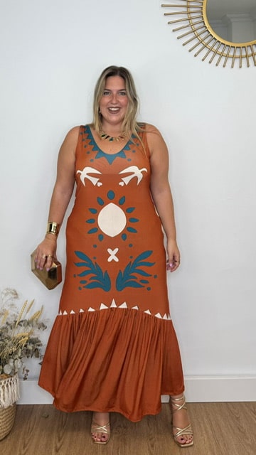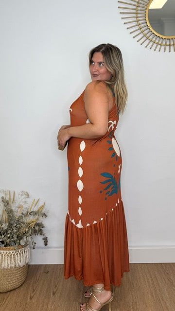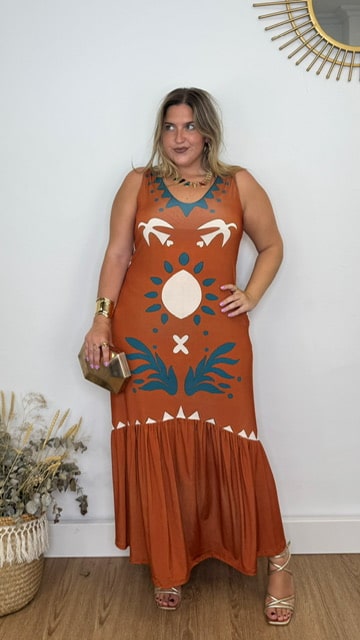vestido confeccionado de licra elástica en color teja con estampado. Talla única válida desde la 38 hasta la 44.