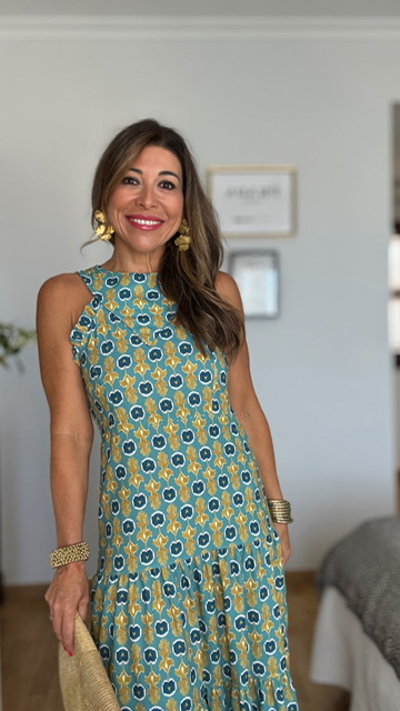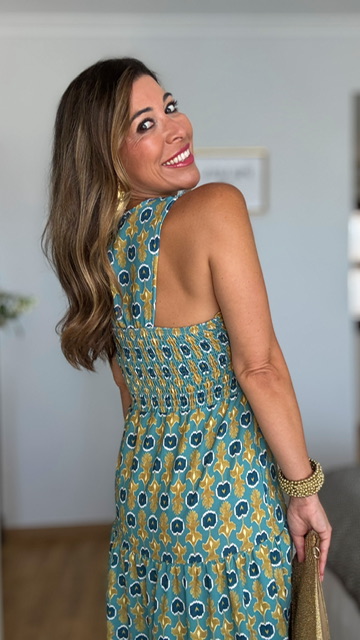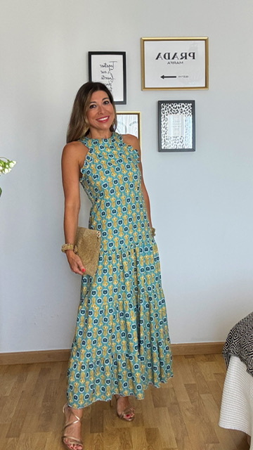 Vestido con estampado de flores en color petróleo con nido de abeja en la parte trasera. Talla única válida desde la 36 hasta la 40.
