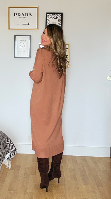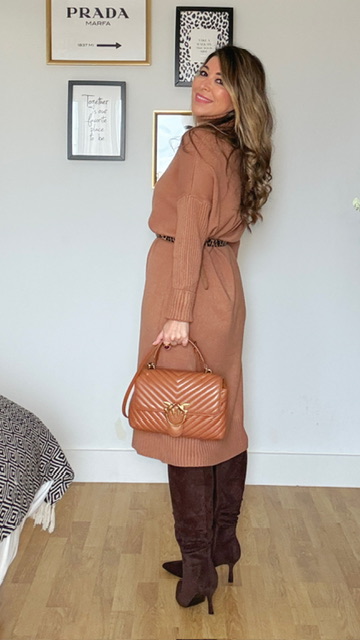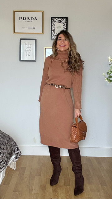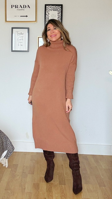 Vestido confeccionado en tejido de punto con cuello alto en color camel. Talla única válida desde la 36 hasta la 44. Complementos no incluidos.