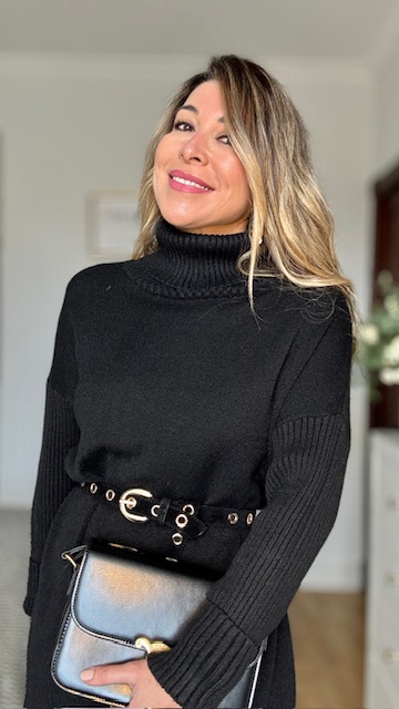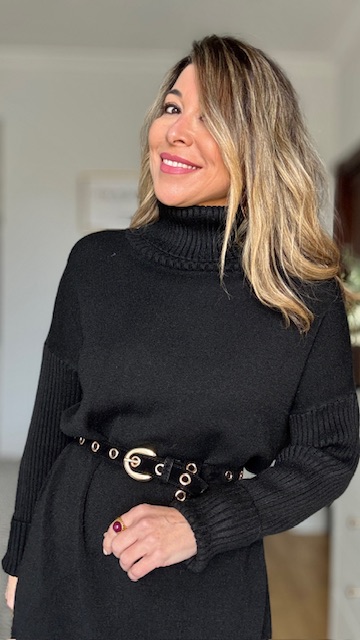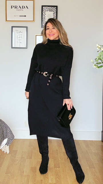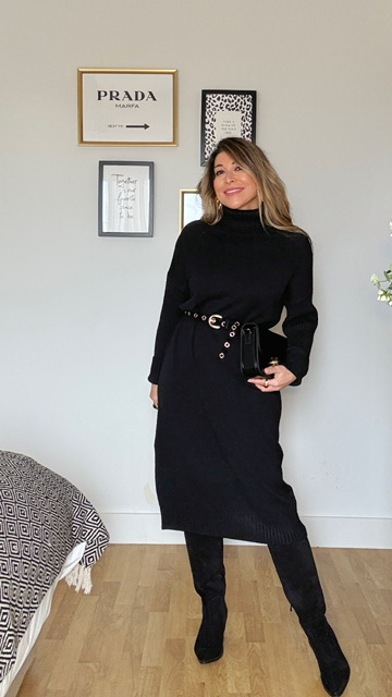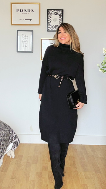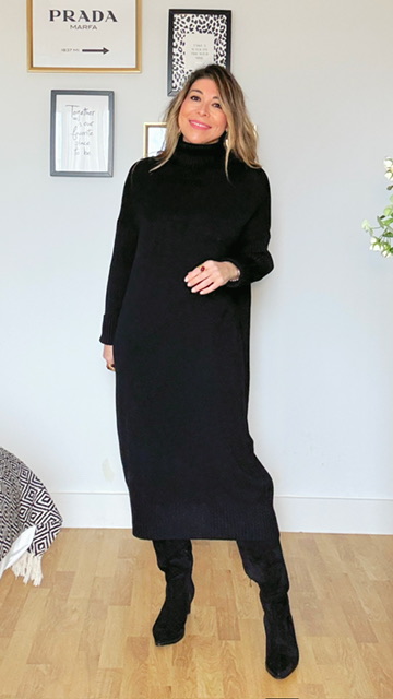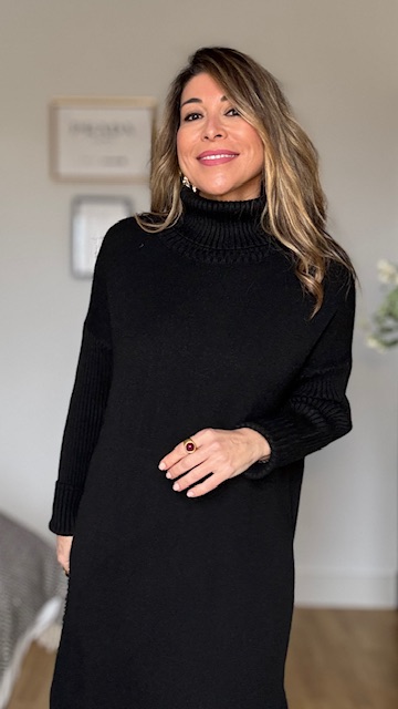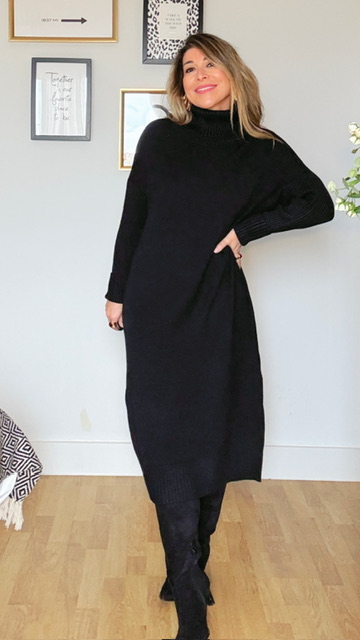Vestido confeccionado en tejido de punto con cuello alto en color negro. Talla única válida desde la 36 hasta la 44. Complementos no incluidos.