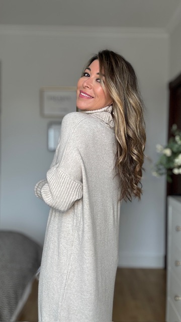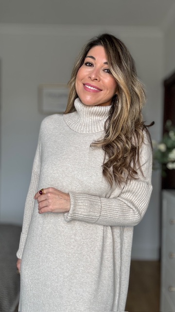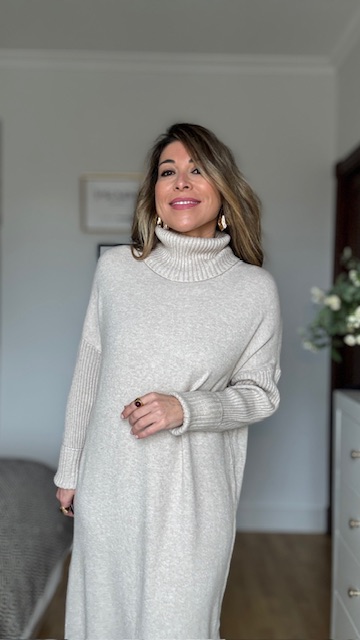 Vestido confeccionado en tejido de punto con cuello alto en color topo. Talla única válida desde la 36 hasta la 44.