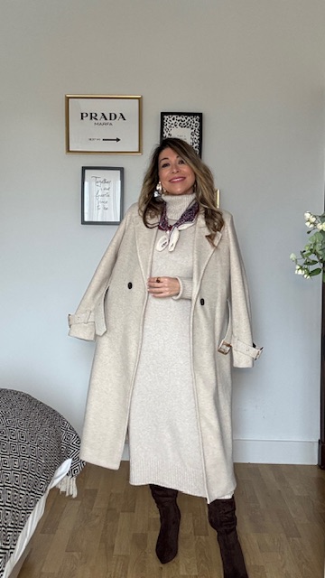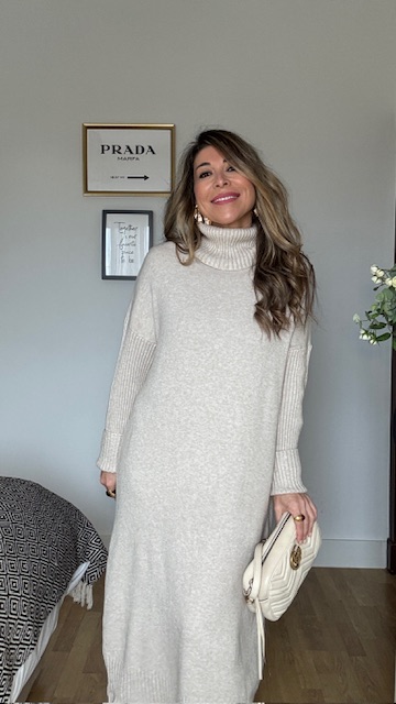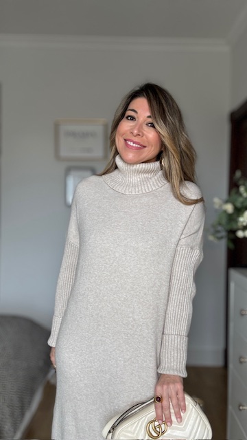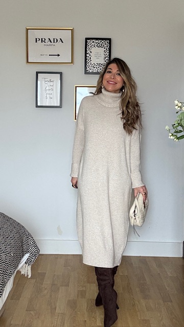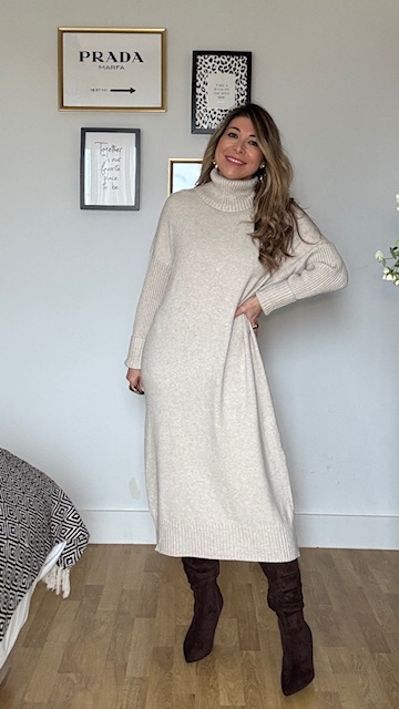 Vestido confeccionado en tejido de punto con cuello alto en color topo. Talla única válida desde la 36 hasta la 44. Complementos no incluidos.