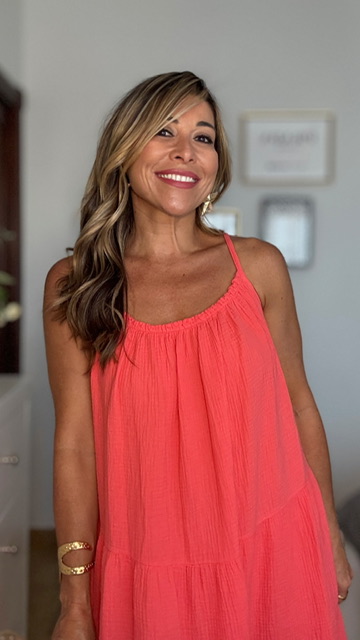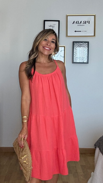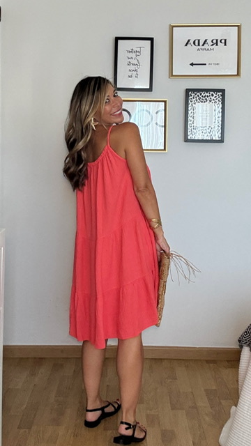 Vestido confeccionado en tejido de muselina en color rosa. Talla única válida desde la 36 hasta la 44.