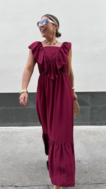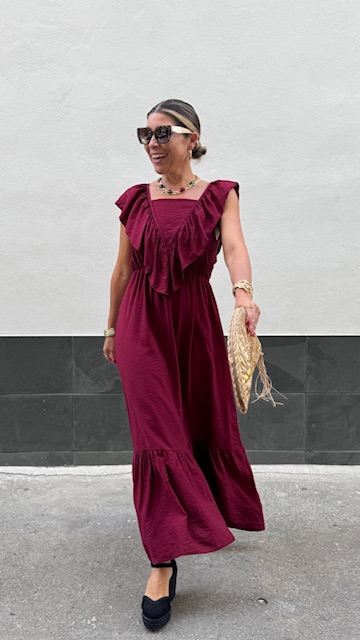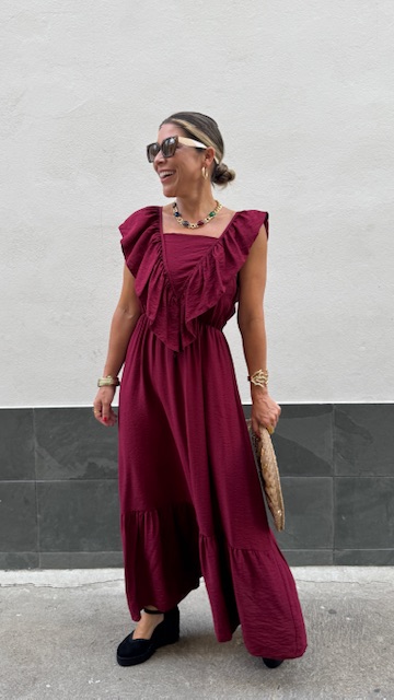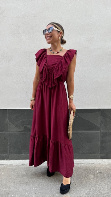 Vestido en color burdeos confeccionado en tejido de viscosa con volante en parte delantera y trasera. Talla única válida desde la talla 36 hasta la 40.