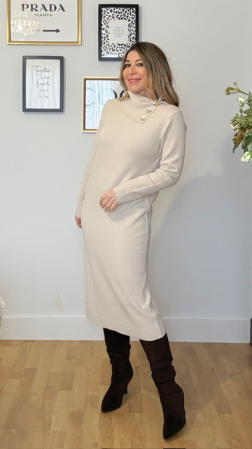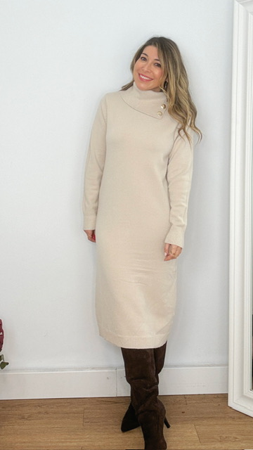 Vestido confeccionado en tejido de punto con cuello asimétrico en color beige. Talla única válida desde la 36 hasta la 44.