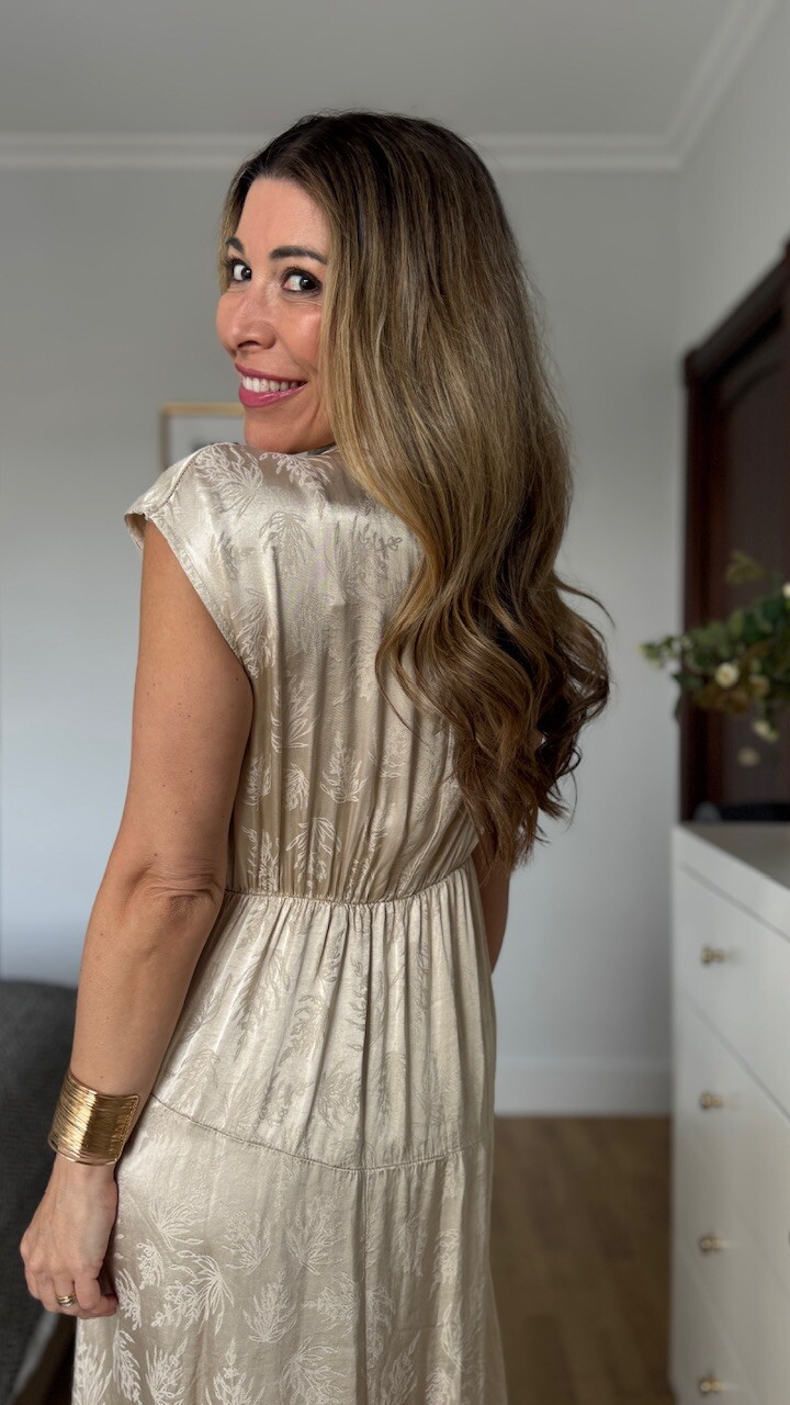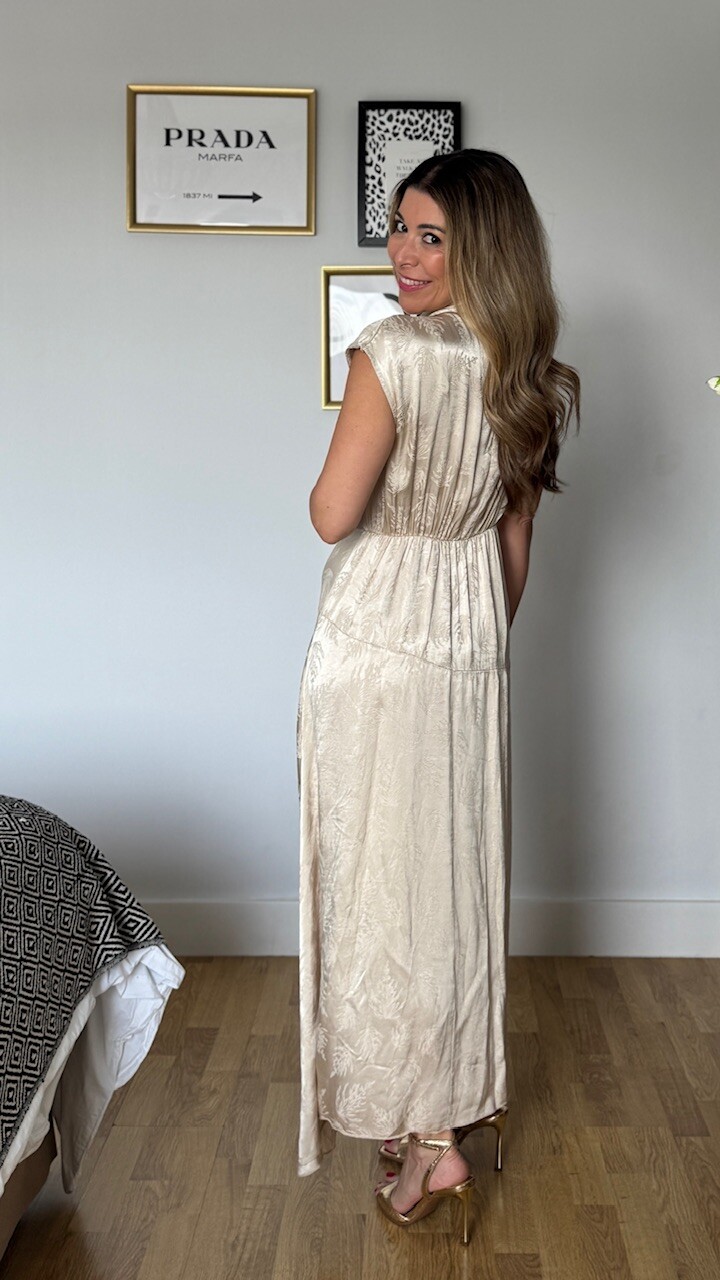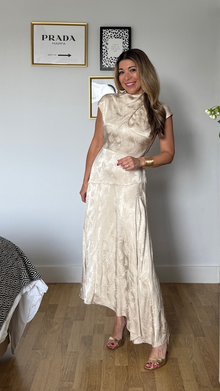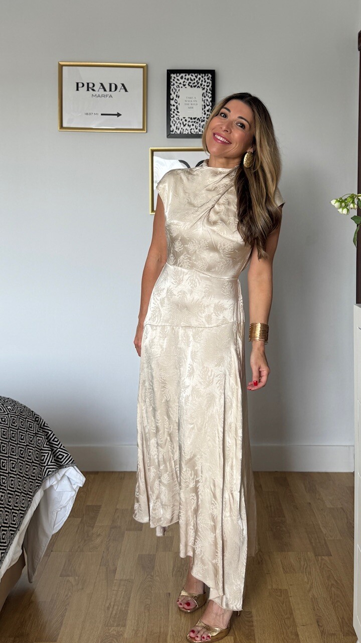 Vestido midi en color beige confeccionado en tejido satinado con un delicado estampado. Lleva un sofisticado cuello alto drapeado y una falda fluida con caída. Talla única válida desde la talla 36 hasta la talla 42.