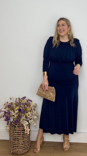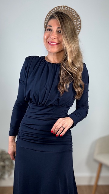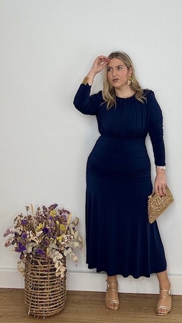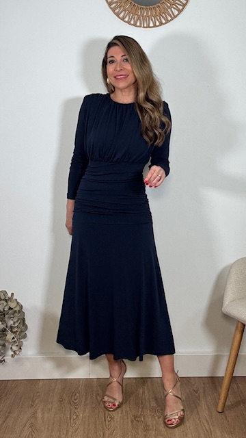 Vestido de invitada en color azul marino de mangas largas, con escote cerrado y frunce en la parte inferior del vestido. Talla única válida desde la 36 hasta la 44.