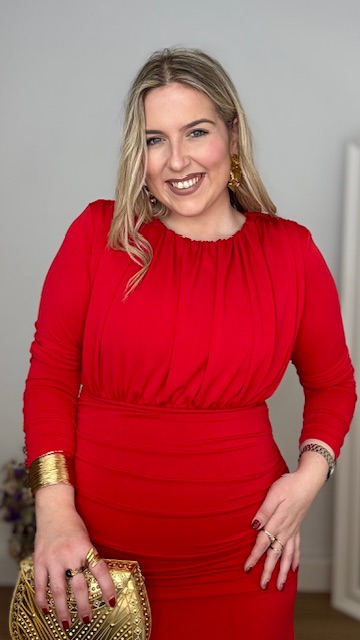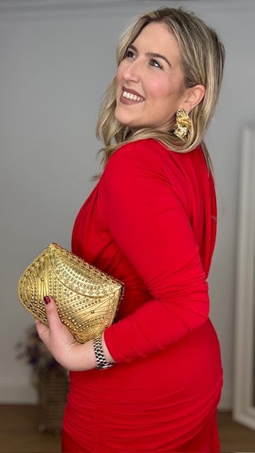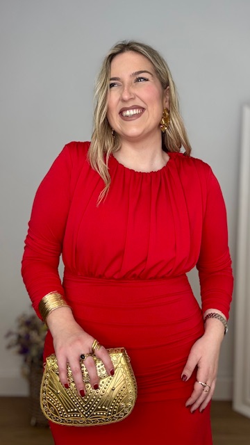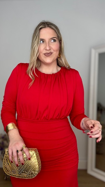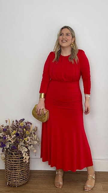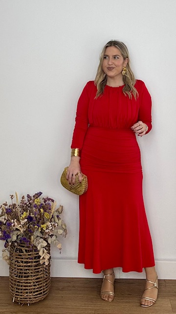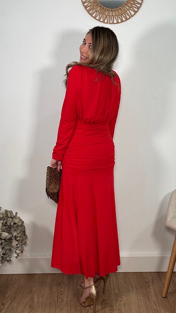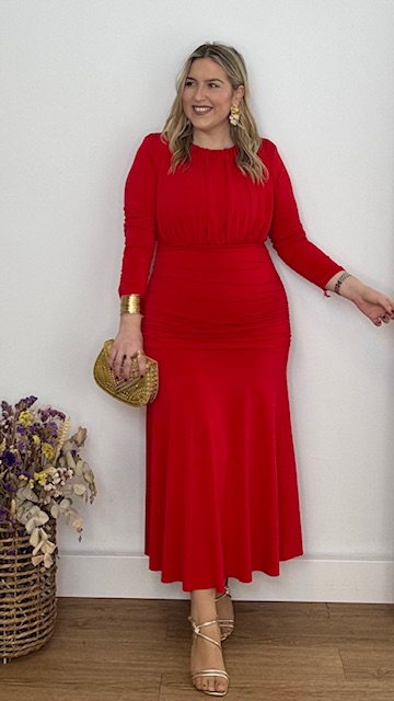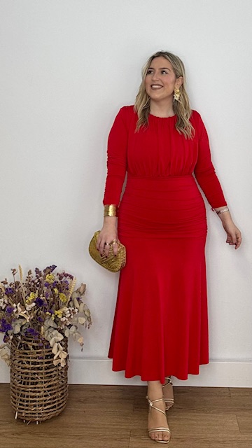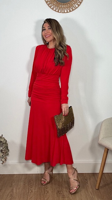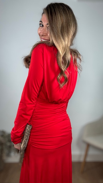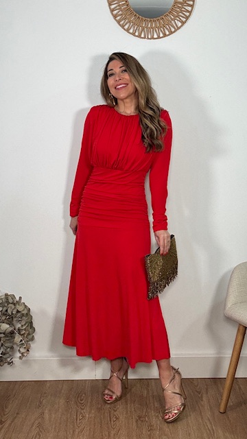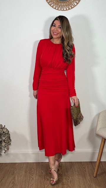 Vestido de invitada en color rojo de mangas largas, con escote cerrado y frunce en la parte inferior del vestido. Talla única válida desde la 36 hasta la 44.