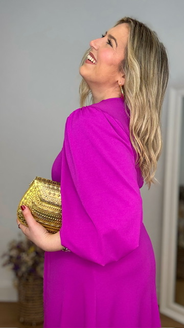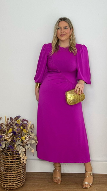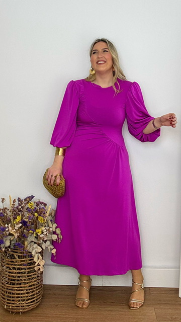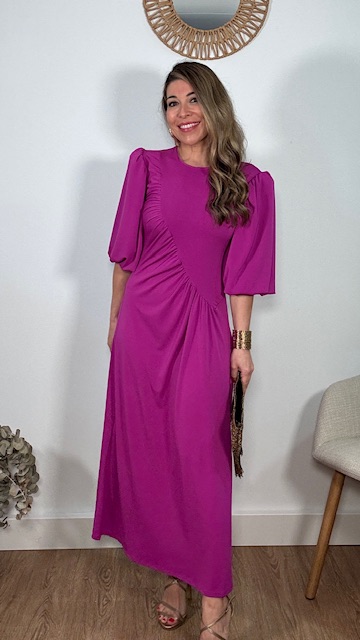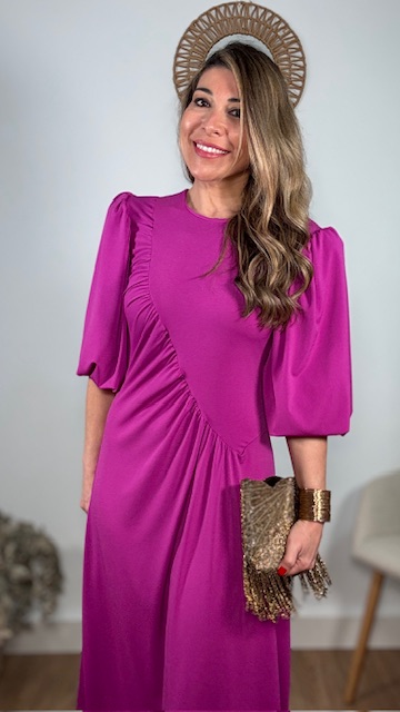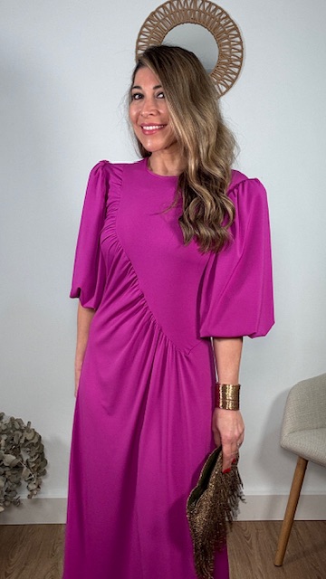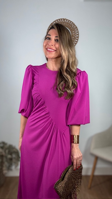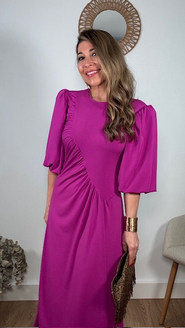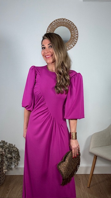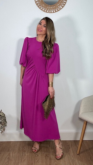 Vestido de invitada con mangas abullonadas en color buganvilla. Talla única válida desde la 36 hasta la 44.