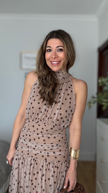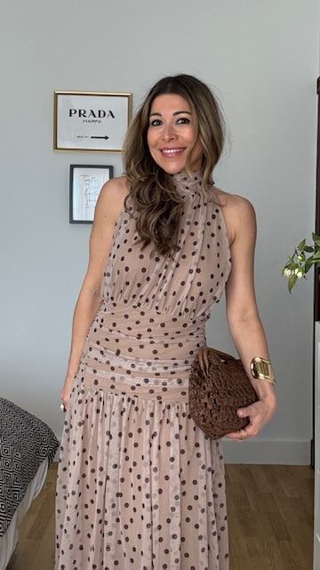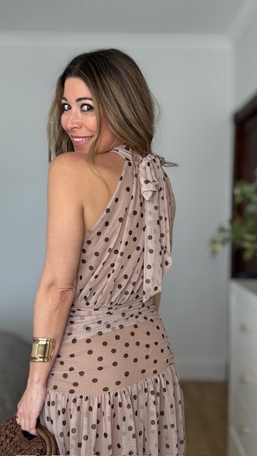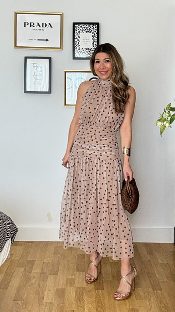 Vestido confeccionado en tejido de tul elástico en color marrón clarito con lunares en negro. Lleva lazada en la parte posterior del cuello y frunce en la cadera. Largo midi. Lleva forro interior. Talla única válida desde la 34/36 hasta la 42.