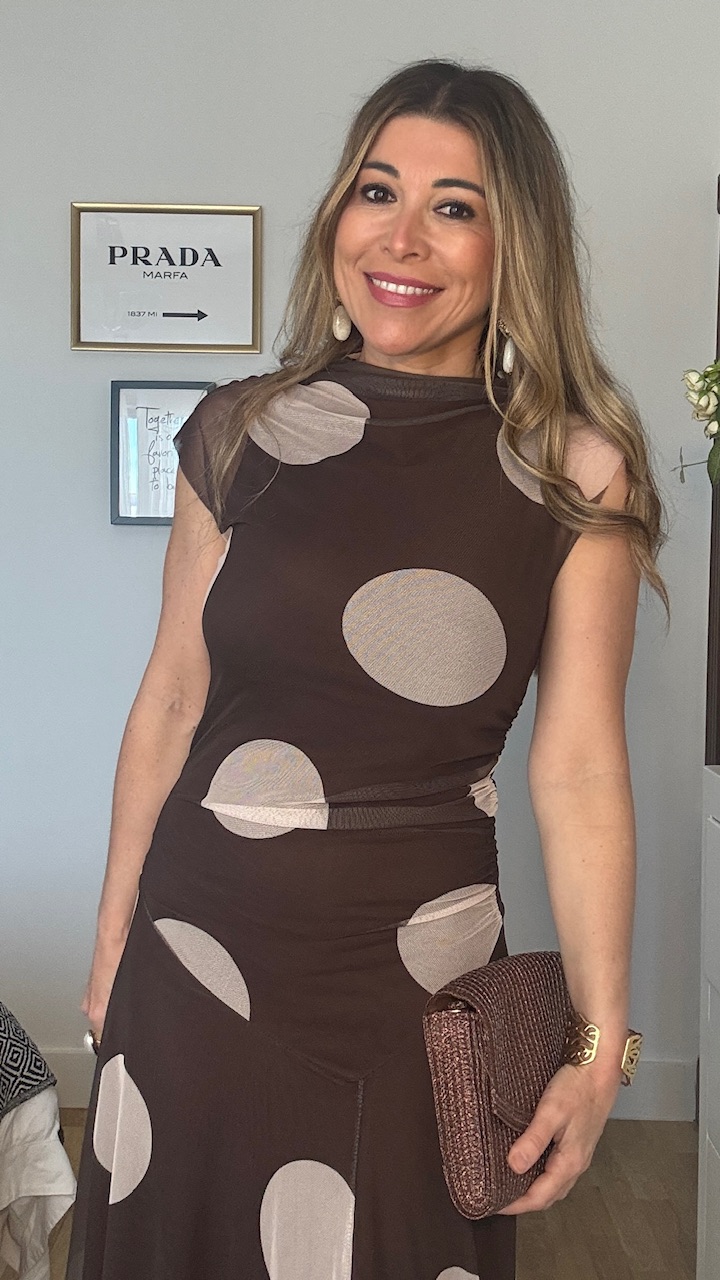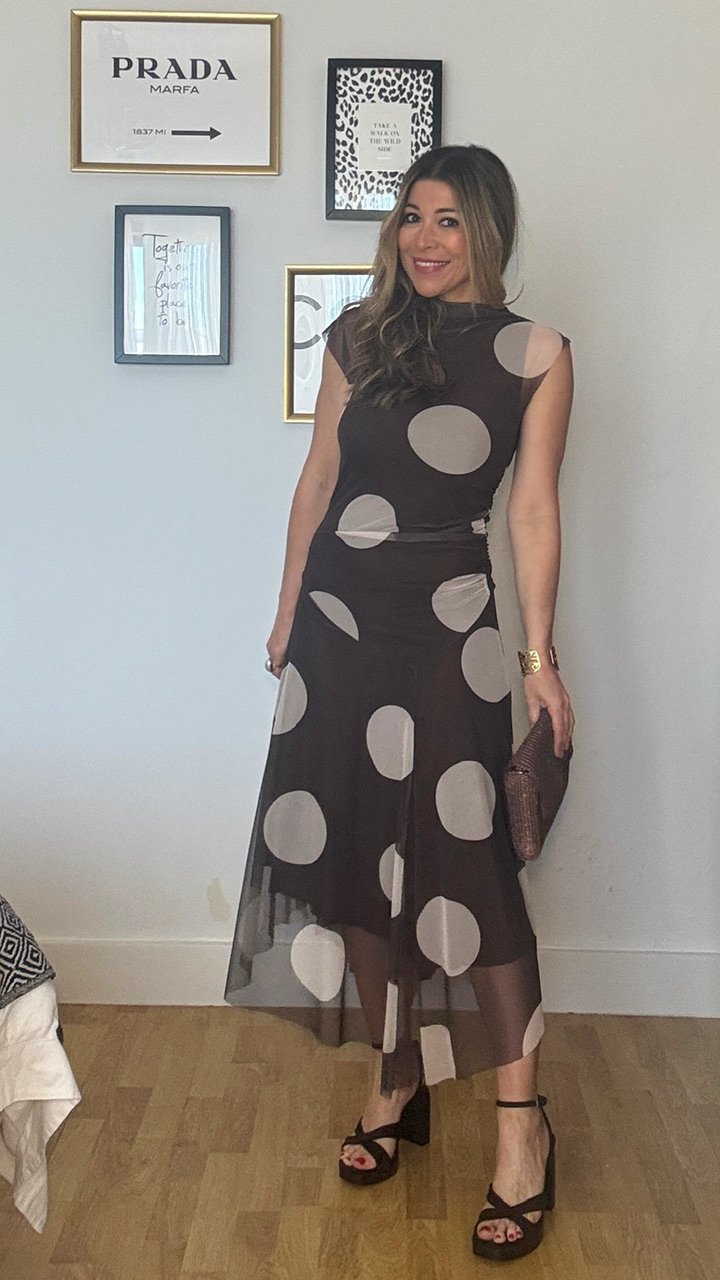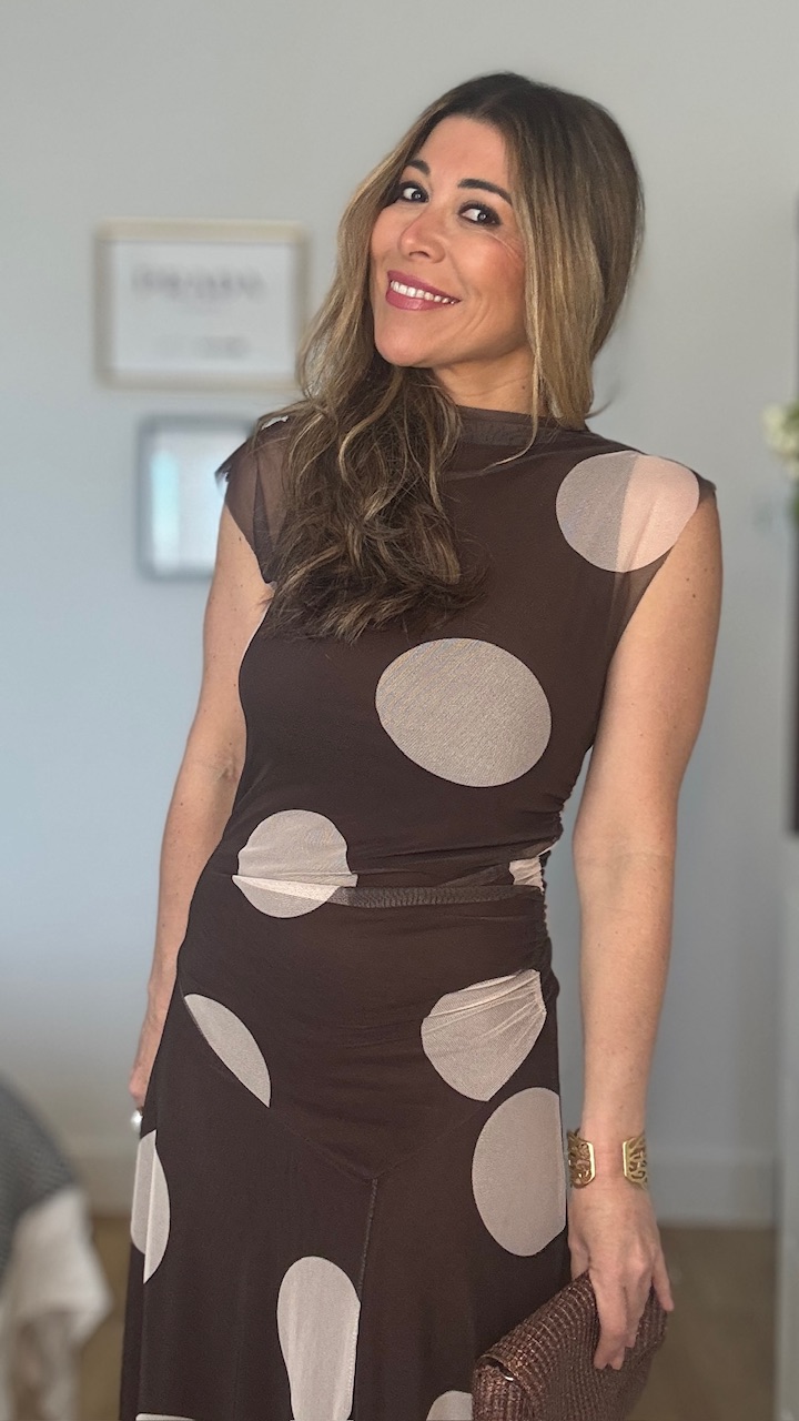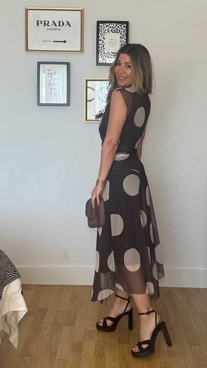 Vestido midi de tul con forro en su interior en color marrón con estampado de lunares en color blanco. Talla única válida desde la talla 36 hasta la talla 40/42.