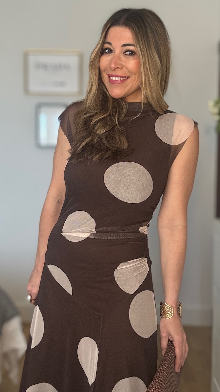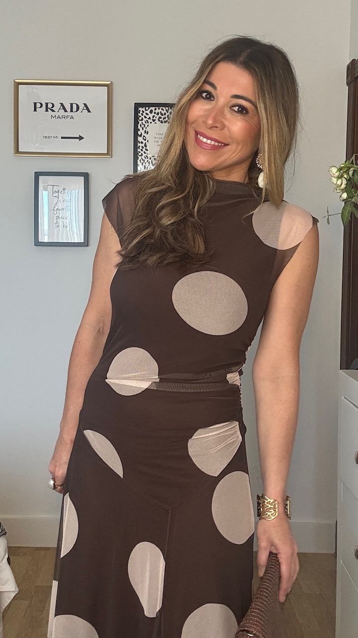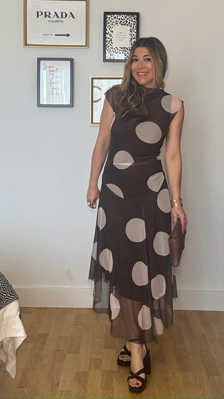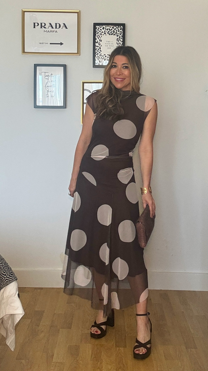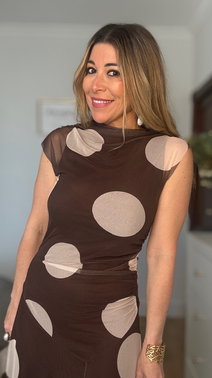 Vestido midi de tul con forro en su interior en color marrón con estampado de lunares en color blanco. Talla única válida desde la talla 36 hasta la talla 40/42.
