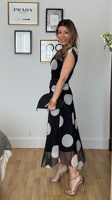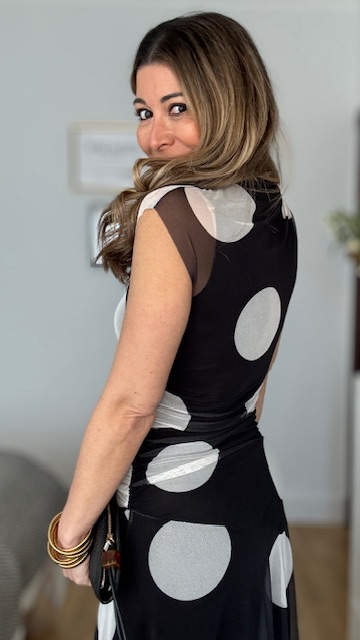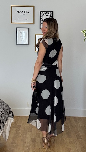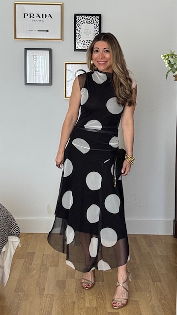 Vestido midi de tul con forro en su interior en color negro con estampado de lunares en color blanco. Talla única válida desde la talla 36 hasta la talla 40/42.