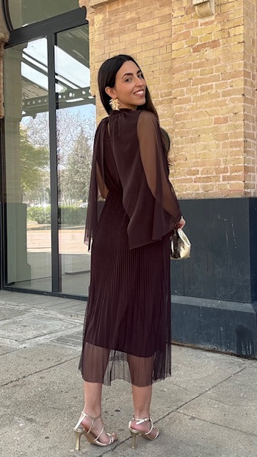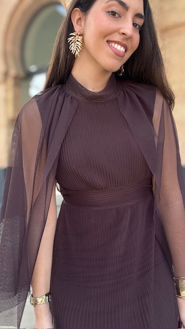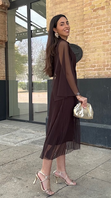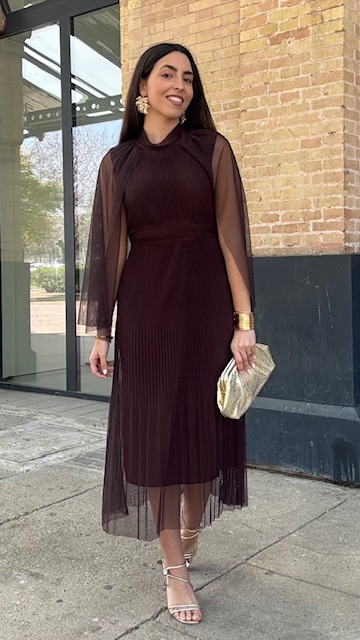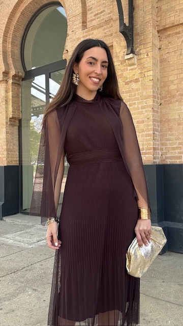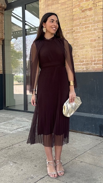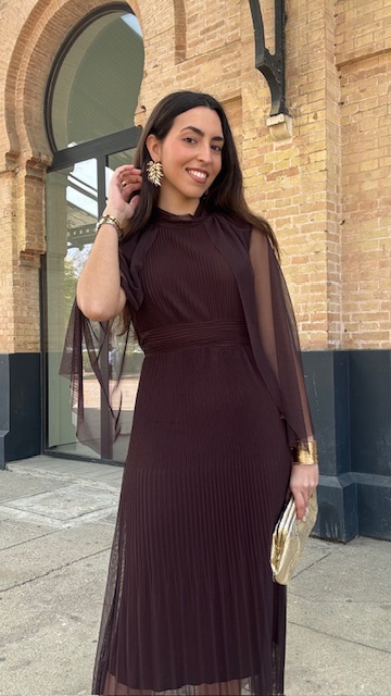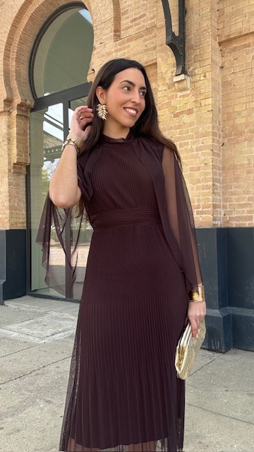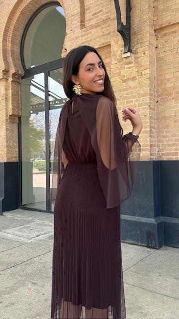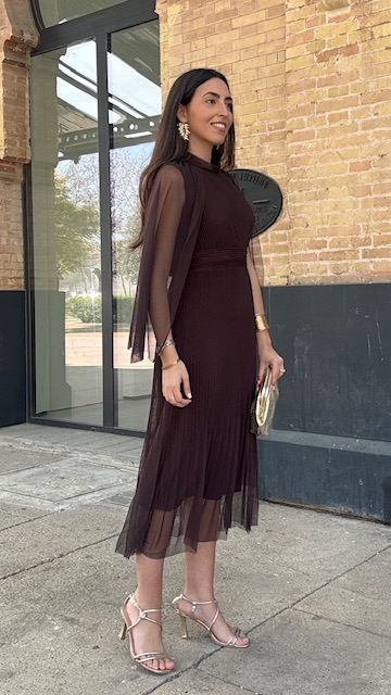 Vestido de invitada midi confeccionado en tejido de tul con capa en color marrón. Talla única válida desde la 36 hasta la 44.