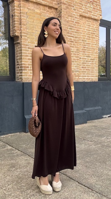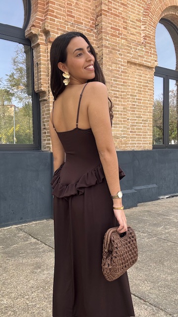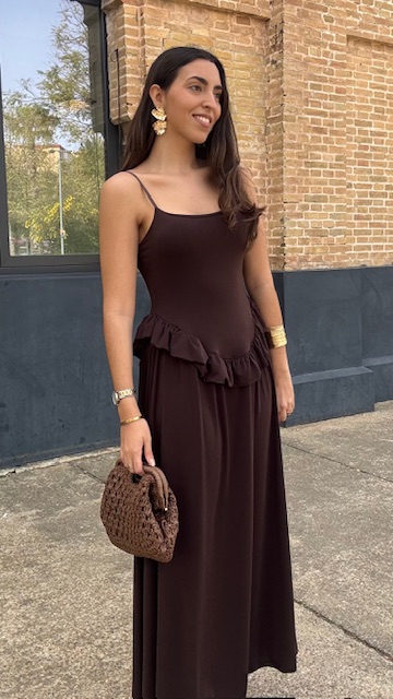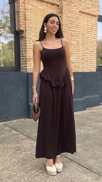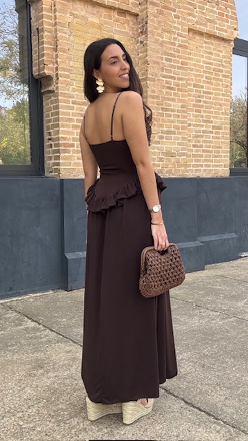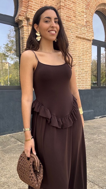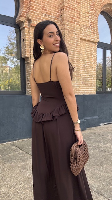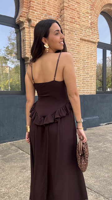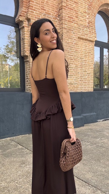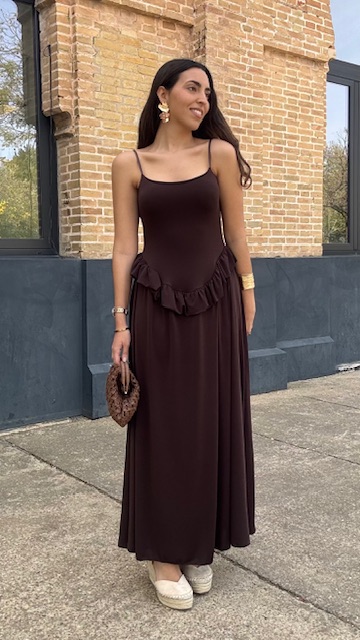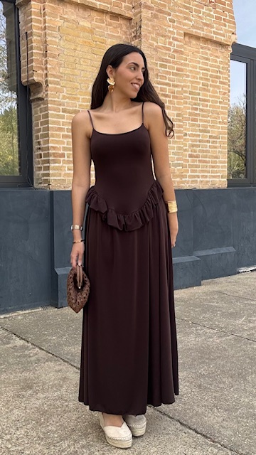 Vestido largo en color marrón. El vestido lleva un volante en la cintura que hace un efecto péplum. Lleva tirantes regulables. Talla única válida desde la talla 36 hasta la talla 44.